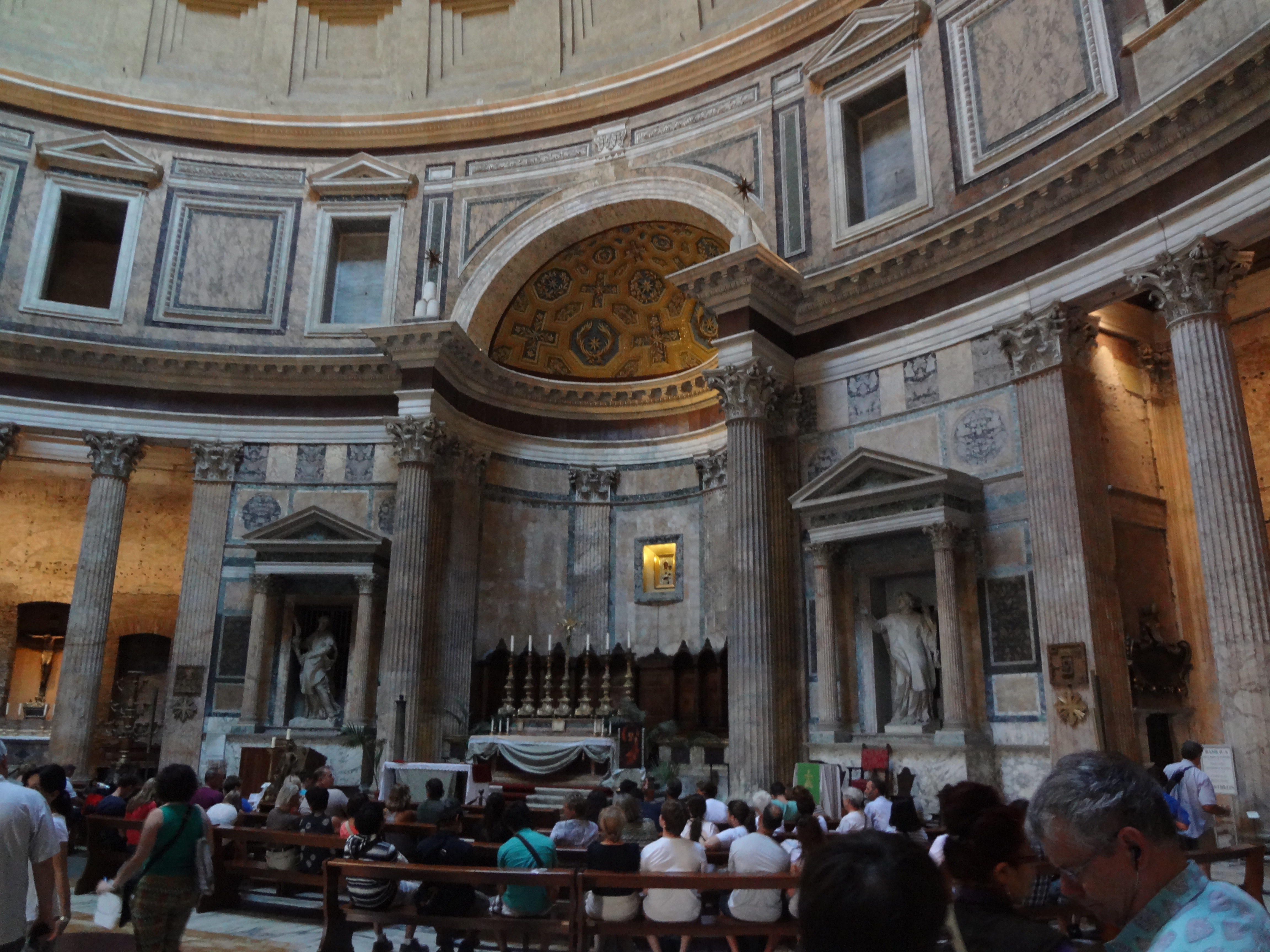 萬神廟的大廰空曠寛敞、莊嚴宏偉、華麗精緻,和老態龍鍾的外觀有天淵之別。穹光從圓孔直穿而入,宛若傲睨萬物,震撼人心,抬頭仰望穹頂,茫茫穹蒼似乎就在穹頂圓孔處,卻又觸手不可及。念悠悠天地、朗朗乾坤,自有主宰,不禁肅然起敬。參觀者雖眾,似乎所有人都對這穹頂生敬畏之心,人人屏息靜氣,腳步聲也幾不可聞,氣氛靜謐而莊重。