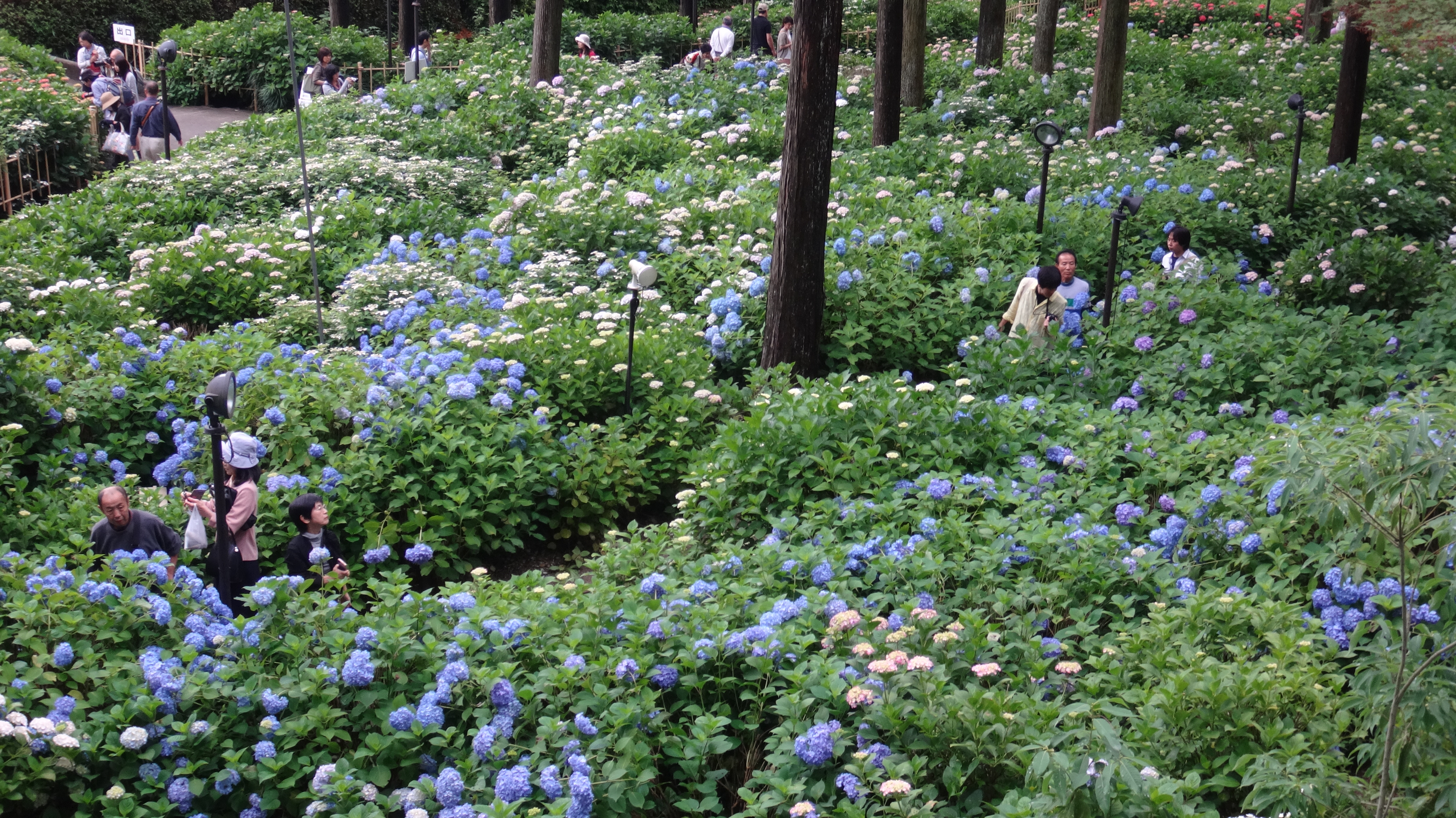 紫陽花開時適逢梅雨季節,在梅雨綿綿下,花苑內紫陽花變得朦朦朧朧,彷若白居易《琵琶行》裡那名猶抱琵琶半遮面的笑靨,令人心動。但片刻後,烏雲盡去,陽光灑落,那一望無際的紫陽花叢披上了亮澤,奼紫嫣紅與青翠欲滴,交織成色彩絢麗的錦繡綢緞,目不暇給,令人心曠神怡,澄滌胸襟。紫陽花灌木約高米餘至兩米,花叢裡曲徑通幽,岔路橫生,沿著花叢裡蜿蜒小徑賞花,當小徑愈來愈狹窄,滿以為是山窮水盡而前無去路,正欲掉頭之際,忽然豁然開朗,原來是柳暗花明又一村,眼前出現一條平坦闊道。在紫陽花苑內,既要看花,也要找路,乃一樂也。