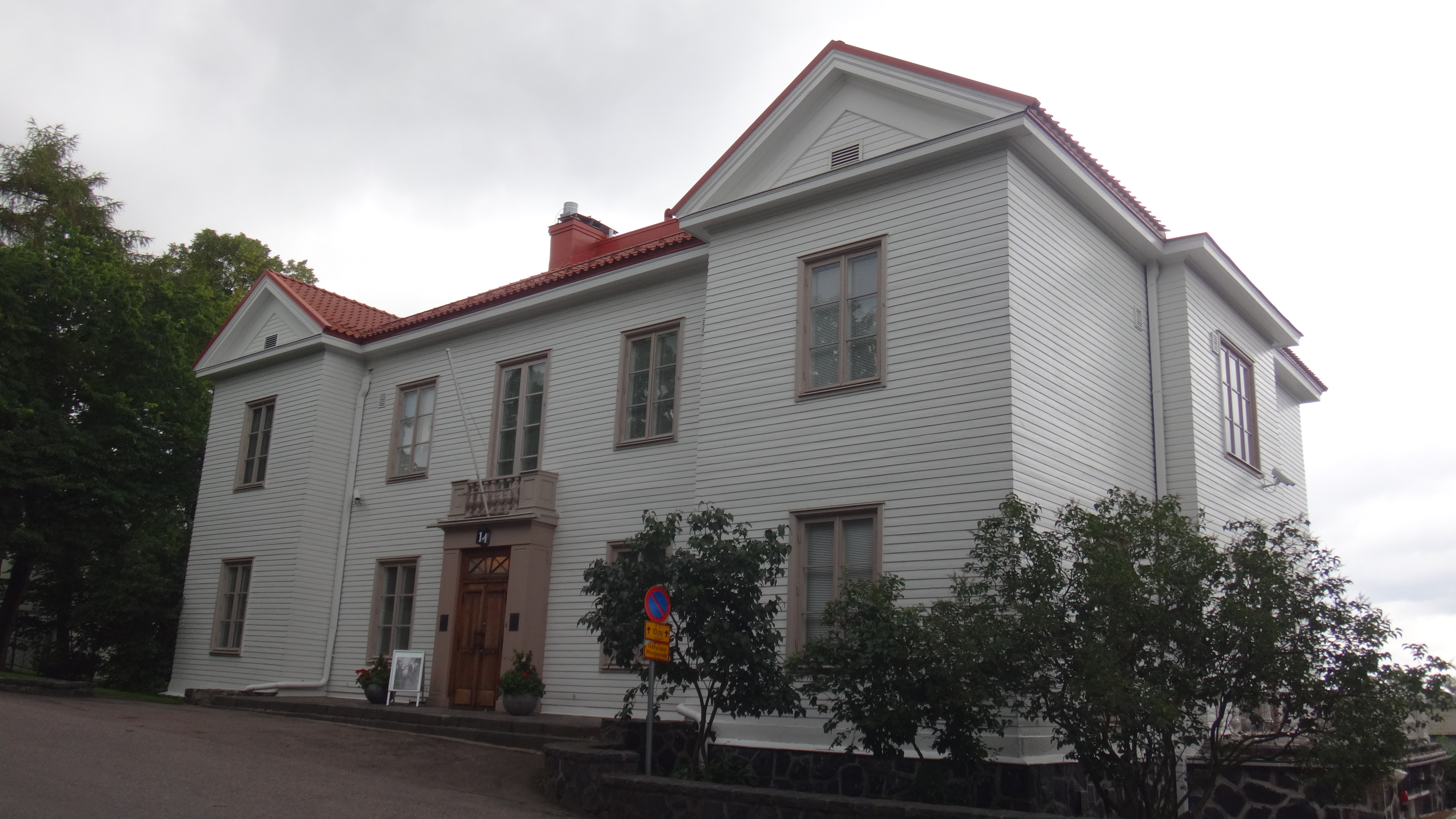 曼納海姆故居位於海邊的一座小山丘上,其貌不揚,白色牆壁、紅瓦屋頂。故居周圍沒有任何引人注視的標記,只在門前豎立了一張小海報。我微感詫異,全國第一偉人的紀念館,門前陳設竟是如此簡單。也多虧這張小海報,否則,還以為去錯地方摸錯門!