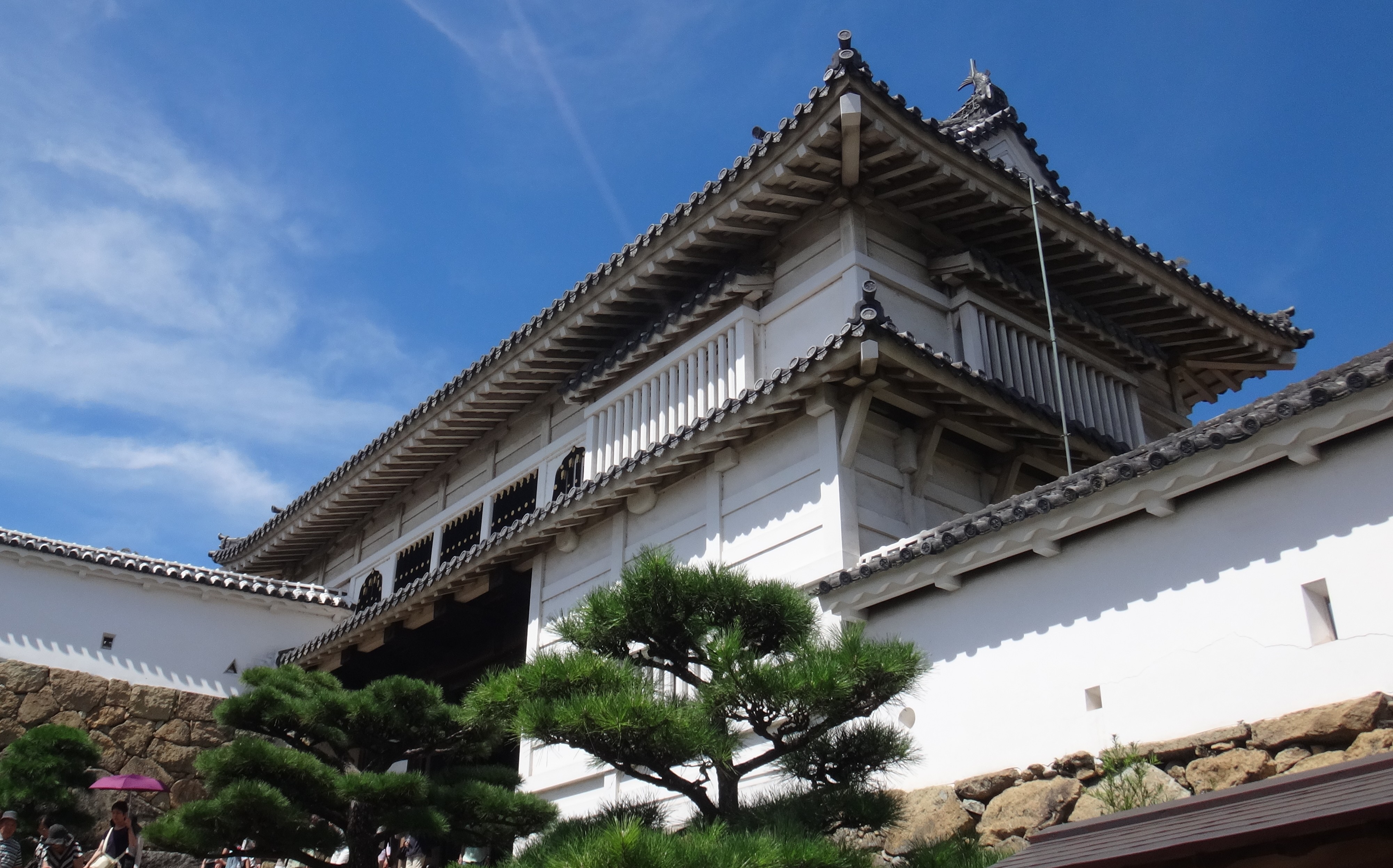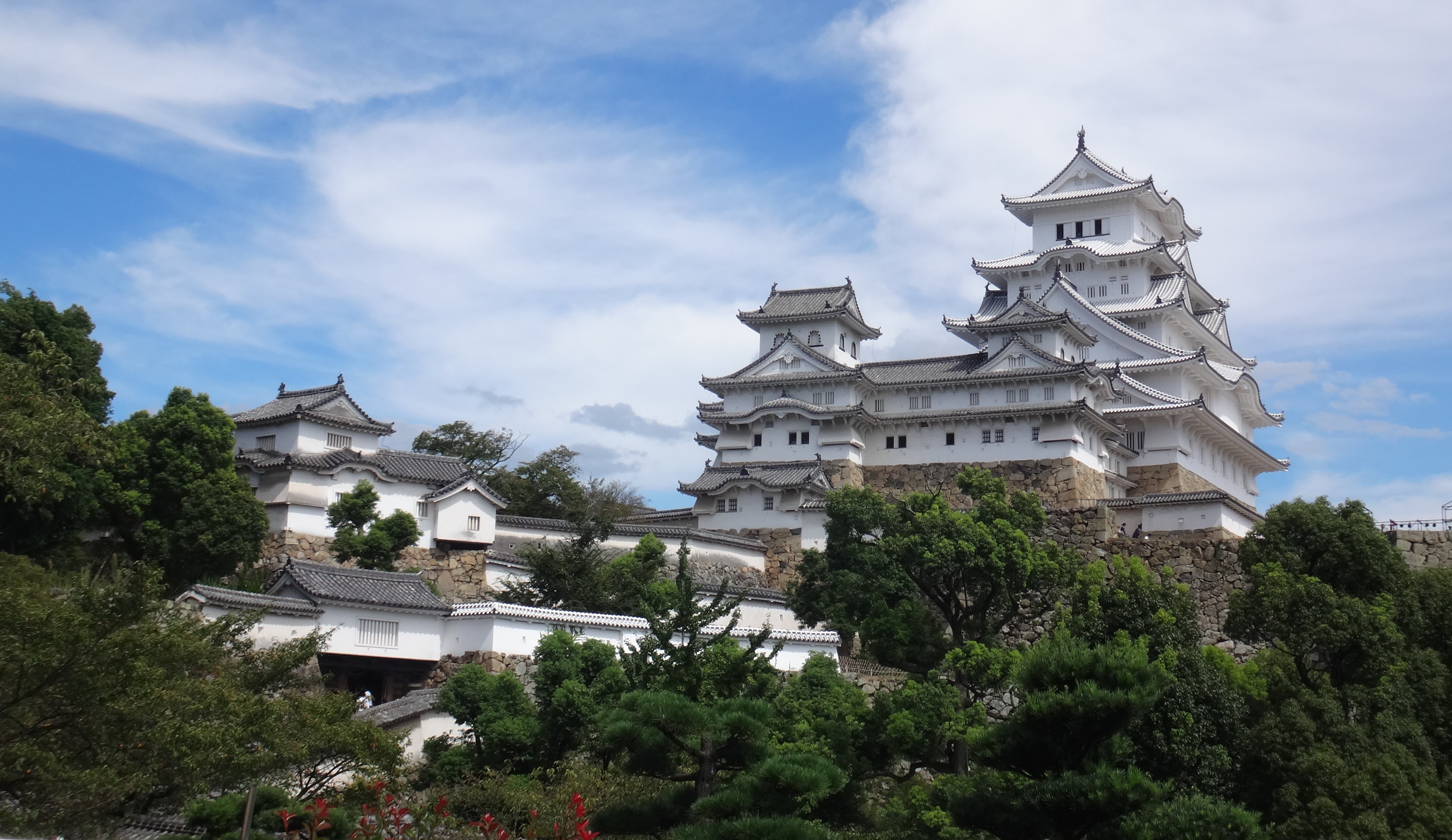 跨過城橋,入了正門口,放眼遠眺,便是背靠藍天的姬路城天守,不禁想起唐代詩人壬勃的《膝王閣序》:「層巒聳翠,上出重霄;飛閣流丹,下臨無地。」。姬路城有白鷺之城之美譽,應該是形容那座傲然屹立的天守,如同正一頭正蓄勢待發,準備展翅高飛的白鷺。