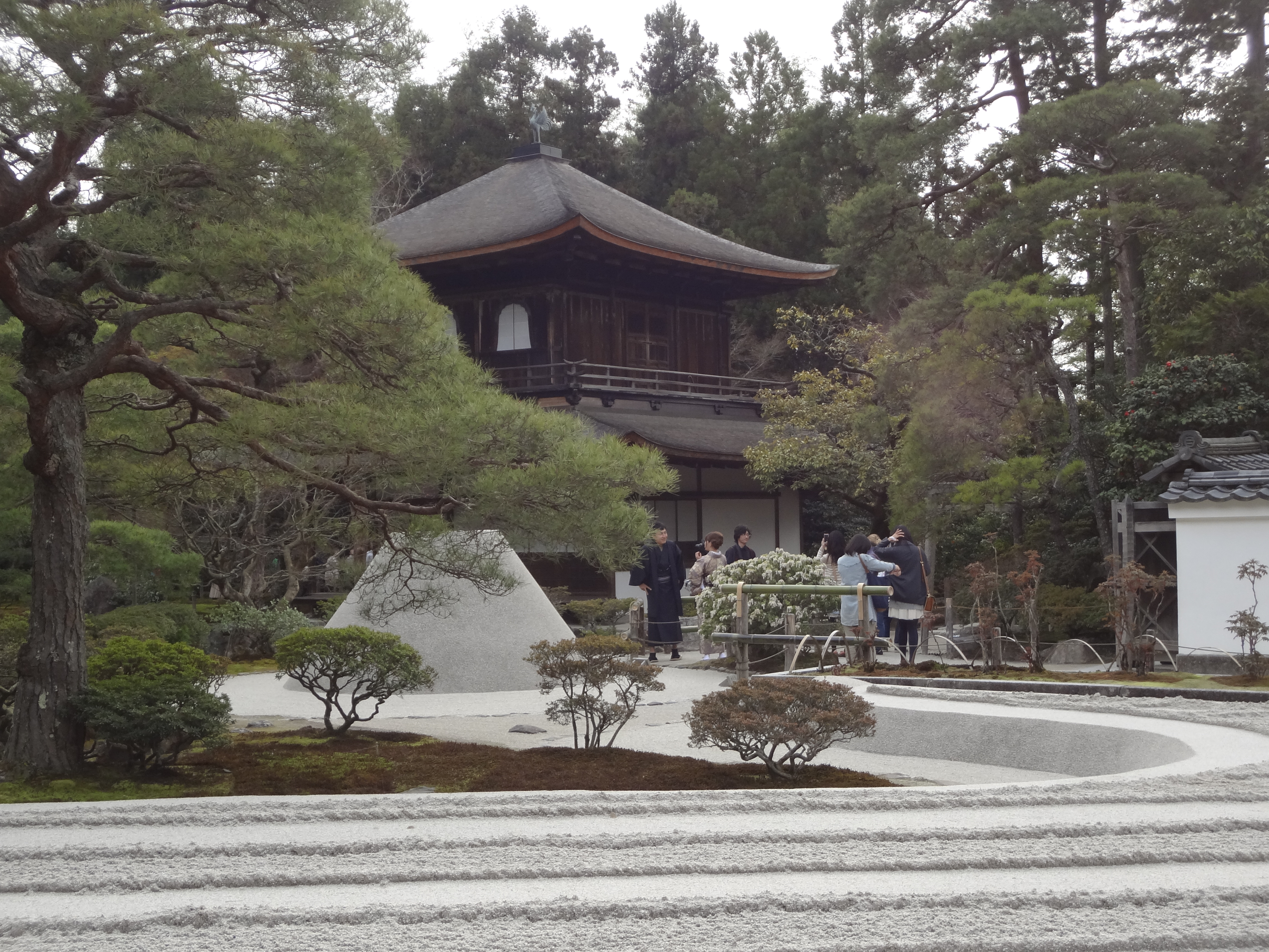 走到參道盡頭然後左轉,眼前豁然開朗。映入眼簾的就是用白砂堆砌成的沙丘及條紋沙灘,分別稱為向月台及銀沙灘。據說,前者象徵日本的富士山,後者則象徵中國的西湖。沙灘的條紋是僧侶用釘耙所耙的,乃修行一部分。