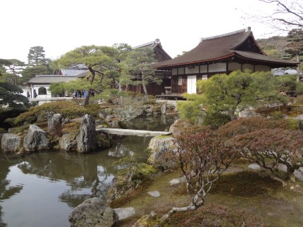 東山殿就如深宅大院,山莊的佈局錯落有致,水池、石橋、松樹、房舍如星羅棋佈,令初訪者目不暇給、眼花撩亂,如劉姥姥進大觀園。不過歲月不留情,從最初保存下來的就只剩下那座銀閣及東求堂。