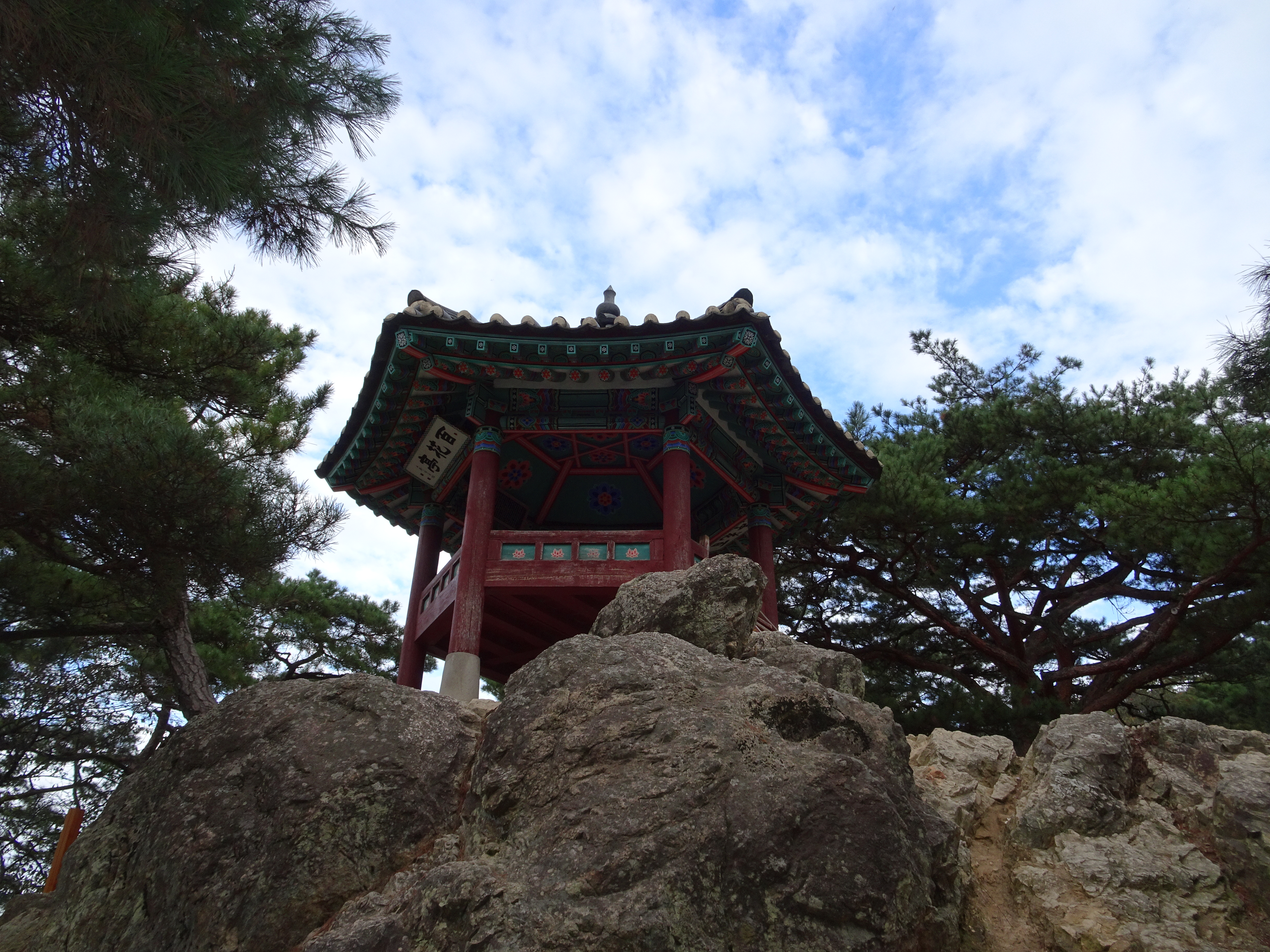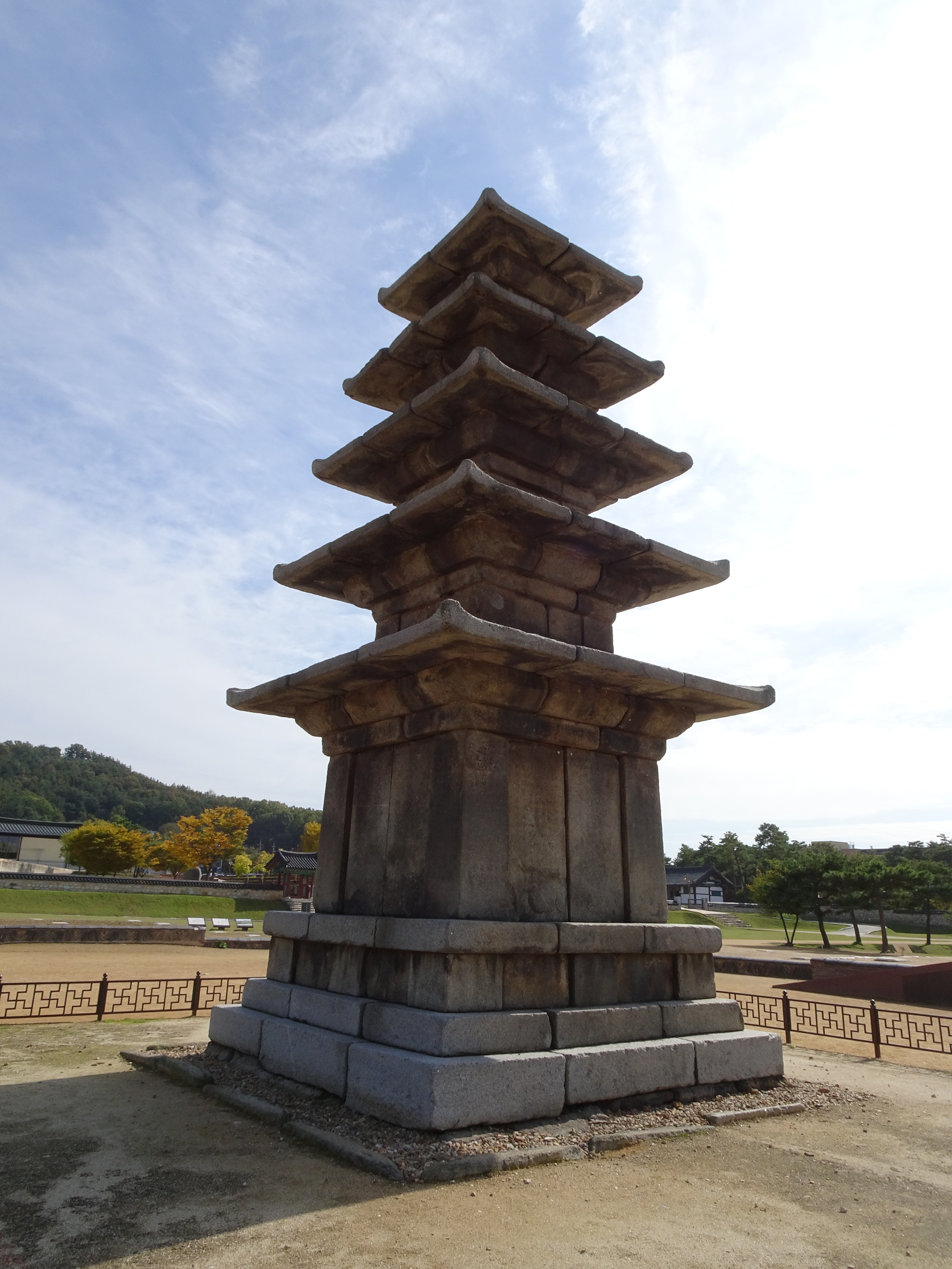 離開扶蘇山城,去了定林寺遺址。定林寺曾經是朝鮮最大的寺院建築群,大部分的古剎禪寺早已灰飛煙滅,一座五層石塔屹立在偌大的空地上,塔上鑄刻了蘇定方平定百濟的銘文。無情的歲月在其身上留下一道道的裂痕。