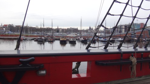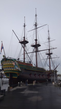 阿姆斯特丹海事博物館(Amsterdam Maritime Museum)前身是海軍倉庫,館內展出大量航海時代的文物,史料豐富,讓人緬懷荷蘭昔日的崢嶸歲月。博物館的多媒體巧奪心思,讓孩子樂而忘返。戶外有一艘複製的船艦,名「阿姆斯特丹號」。17、18世紀時,有無數艘這般大小的船隻從阿姆斯特丹等海港揚帆出海,浩浩蕩蕩,開啓了一段段波瀾壯闊、激動人心的風雲史詩。我在一個嚴冬的早上登上甲板參觀,太陽藏在烏雲背後,北風呼呼作響,船上的纖繩、桅桿、橫桿被吹得搖搖幌幌,甲板也左搖右擺。以現代人的角度,實在難以想像歐洲人如何能在設備簡陋的桅帆船馳騁海上,縱橫萬里。他們是抱著「不破樓蘭終不還」的決心抑或是「醉臥沙場君莫笑」的覺悟,創造一次又一次扣人心弦的壯舉?
