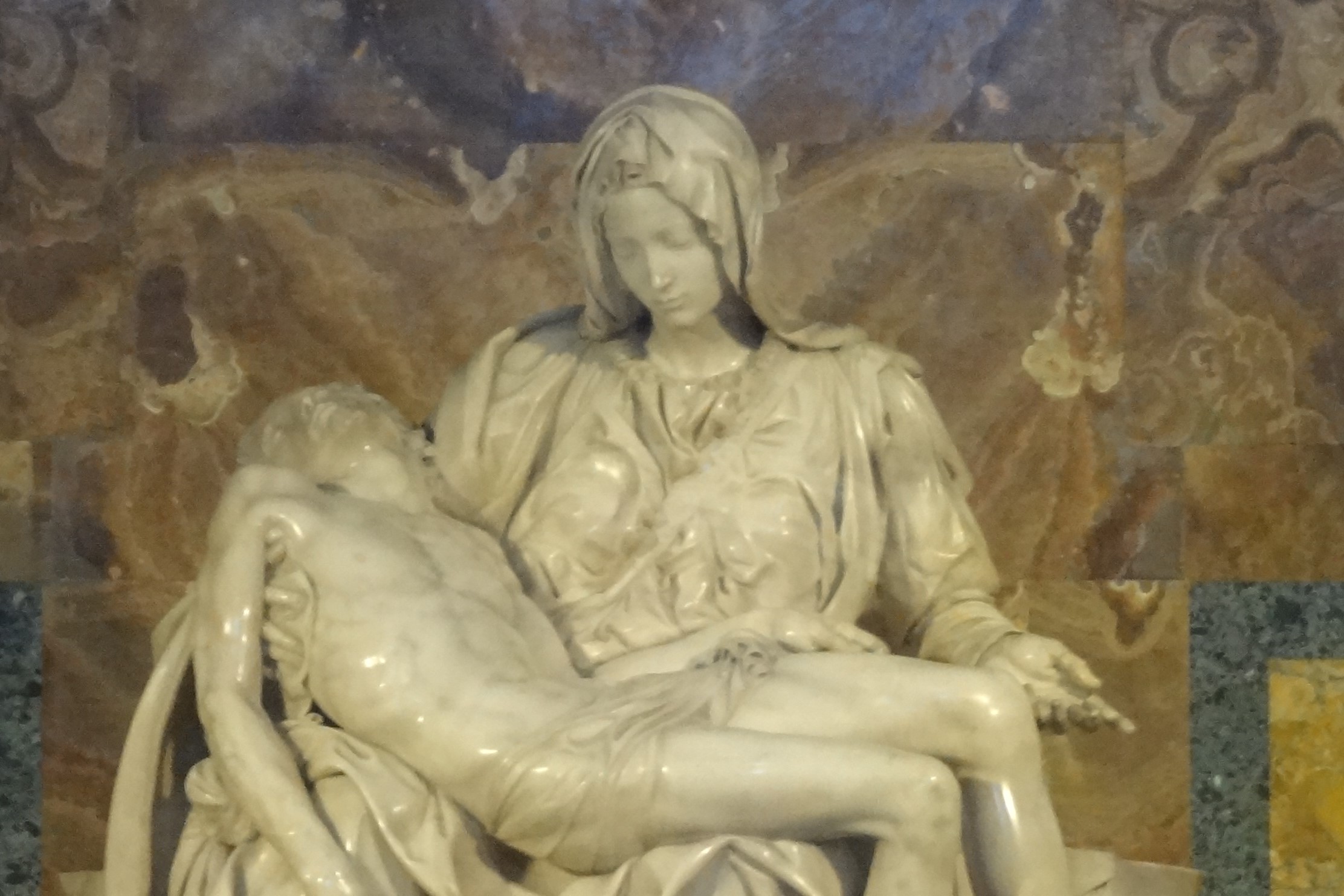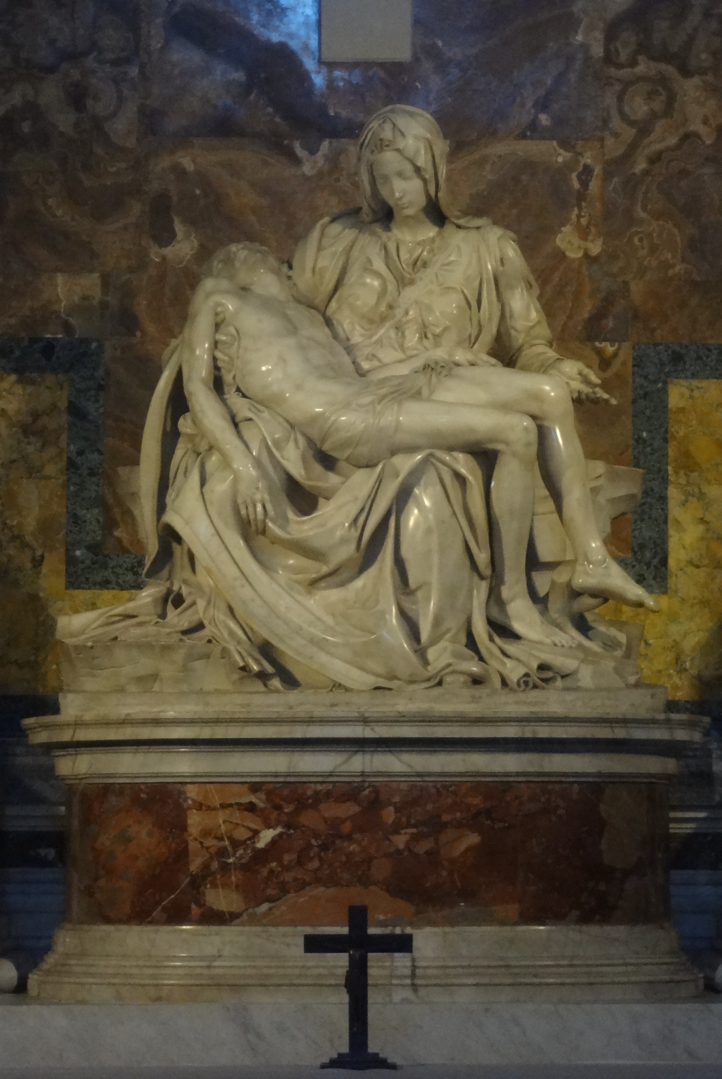 整座雕像呈金字塔形。耶穌的遺體斜臥在聖母的大腿上,頭向後垂,雙腿也是垂下,右手搭在聖母右膝上。聖母右手托著基督右腋下的肋骨處,左手向後攤開,似乎向世人昭示,這位就是為了拯救世人而被釘十字架的聖子。
