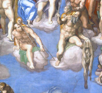 上圖位於左右的分別是聖勞倫斯(Lawrence)及聖巴多羅買(Bartholomew)。前者是早期教會執事,當年他被羅馬人放在烤架上活活烤死。他左肩背著的,便是一個烤架。後者是耶穌十二門徒之一,我在《達文西與《最後的晚餐》(上)》一文曾提及過他。相傳他在印度傳教時,被暴徒剝皮而殉道。他手上提著的便是殉道時被割下之人皮,這張人皮正是米開朗基羅自己的自畫像。米開朗基羅也把自己的助手繪入畫中。那名站在聖巴多羅買身後的男子是弗朗切斯科·德·阿馬多雷(Francesco d’Amadore),又名烏爾比諾(Urbino),乃少數深得大師信任的助手。