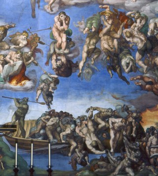 另一邊就是那班將會墜入地獄,接受懲罰之人。那些表情各異,有人哀嚎、有人呷吟、有入咆哮、有人呼冤。有些人企圖逃脫,雲端上的天使,揮拳揍向這些人的腦門,把他們打回地獄。最底部可以看見一位面目猙獰的綠色妖怪,他是希臘神話中冥王的船夫卡戎 (Charon),負責將死者渡過冥河。畫中卡戎正揮動船槳,把船上的乘客趕下船,他似乎厲聲道:「這裡就冥界,你們這些罪人,還不給我滾下船,準備去受折磨!」