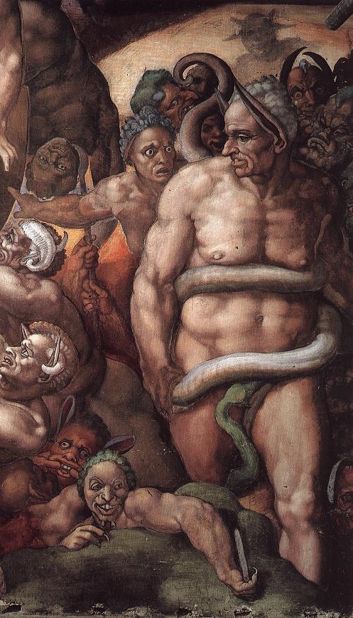 畫面右下角,那位長著一雙驢長朵怪物,是冥界判官米諾斯(Minos)。關於米開朗基羅筆下的米諾斯,還有一段趣事。當他將近完成《最後的審判》時,教宗保祿三世(Paul III)和掌禮官塞西納(Biagio da Cesena)一同參觀該祭壇畫。教宗非常滿意,不過塞西納卻認為它難登大雅之堂。米開朗基羅聽到,心裡有氣,於是他將米諾斯的臉畫成塞西納的樣子,還安排兩條蛇招待他,一條纏著他的上半身,另一條咬其陽具!塞西納嚇了大跳,他哭喪著臉,苦苦哀求保祿三世出面干涉。教宗調侃道:「如果你在監獄,我還有能力將你救出來。不過,你已經跌入地獄,只有上帝可以拯救你了。」