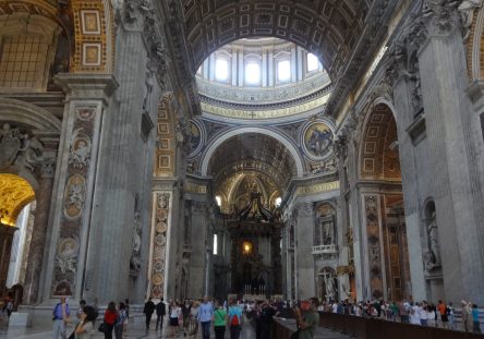 米開朗基羅在教堂的中央,利用了四個巨型柱子及柱墩鞏固穹頂,大大增加空間感,這個設計簡潔利落而不失莊嚴宏偉。當信徒佇立在穹頂的底部,無數束的光芒,透過穹頂底部鼓座的窗戶曬下,如同上帝的恩典與降幅,讓人感受天堂就近在咫尺之近的穹頂之上。有別於哥德式(Gothic)教堂那種神秘肅穆的宗教氣氛,聖彼得大教堂室內寬敞明亮、視野開闊、採光充足的設計符合了文藝復興(Renaissance)以人為本的精神。