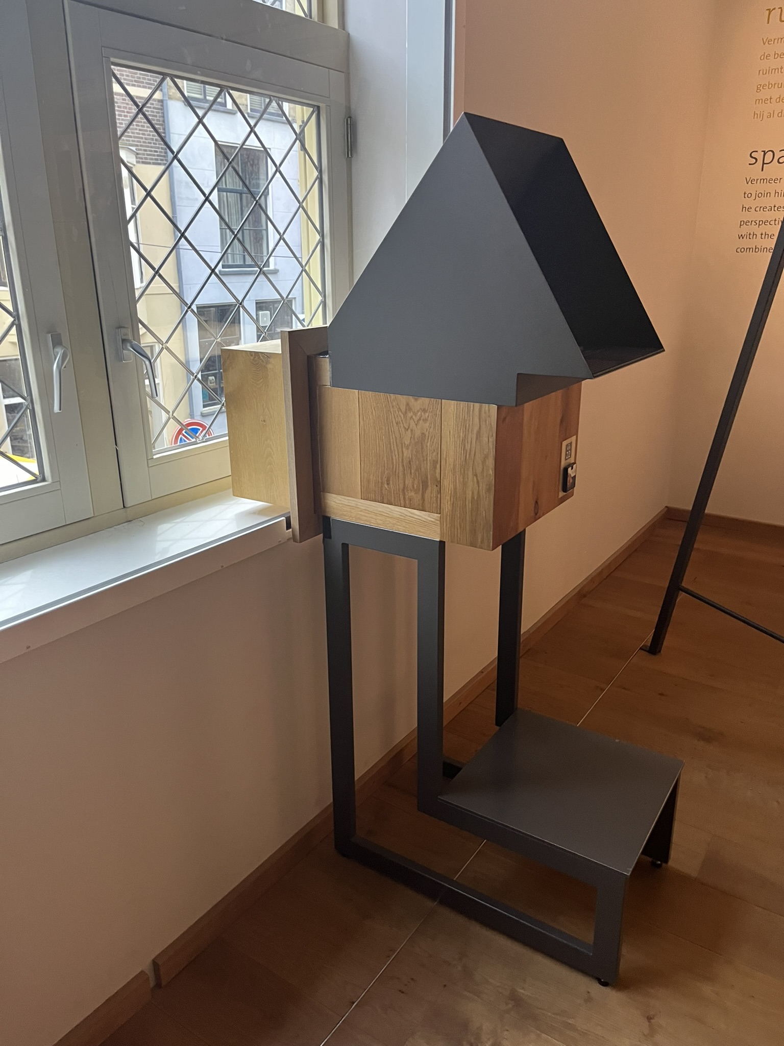 台夫特維梅爾中心(Delft Vermeer Centrum)展出了一個暗箱(Camera Obscura)模型。暗箱是當年畫家的輔助工具,可以說是相機的前身。原理是利用鏡頭,經過暗箱的反光鏡再將影像投射到玻璃上。這樣畫家便可以將三圍景象轉化為二維平面。有人認為為滿維梅爾是利用了此種暗箱,所以他畫內的距離、長短、大小、光點及光線變化,準確無誤,如同相機拍攝的照片。